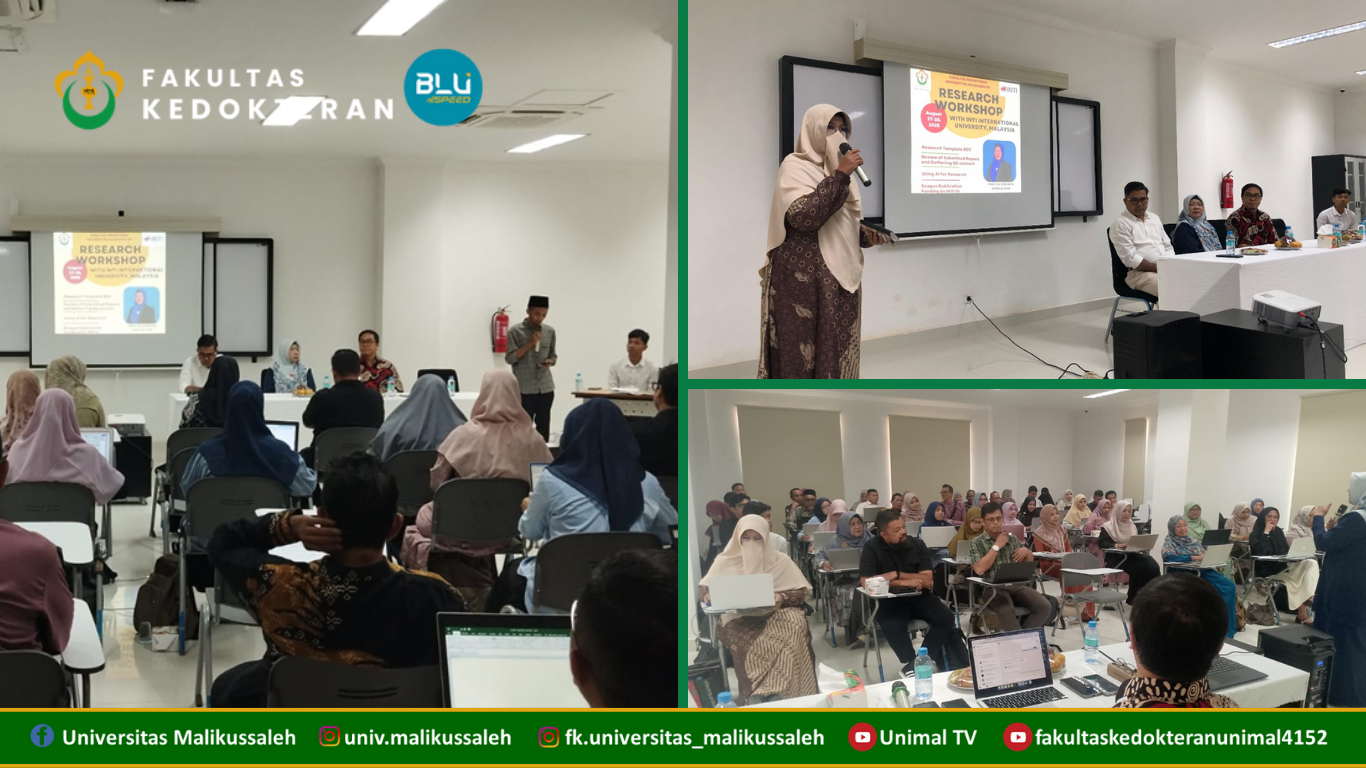 Fakultas Kedokteran Universitas Malikussaleh sukses menyelenggarakan Research Workshop bersama INTI International University, Malaysia pada tanggal 27–28 Agustus 2025 di Gedung Dekanat FK Unimal Lt. 3.