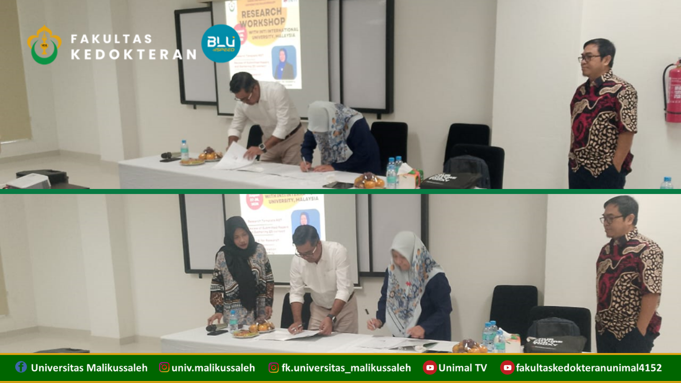 Sebelum workshop dimulai, terlebih dahulu dilakukan penandatanganan Memorandum of Agreement (MoA) antara Fakultas Kedokteran Universitas Malikussaleh dan INTI International University, Malaysia.